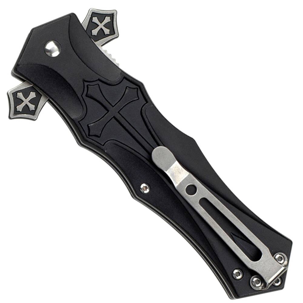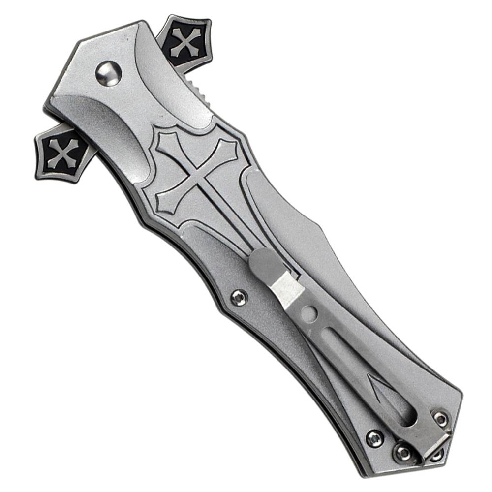 - SPECIAL FEATURES: Spring Assisted, Finger Flipper, Liner Lock, Silver Stainless Steel Handle with Red Cross and Pocket Clip.